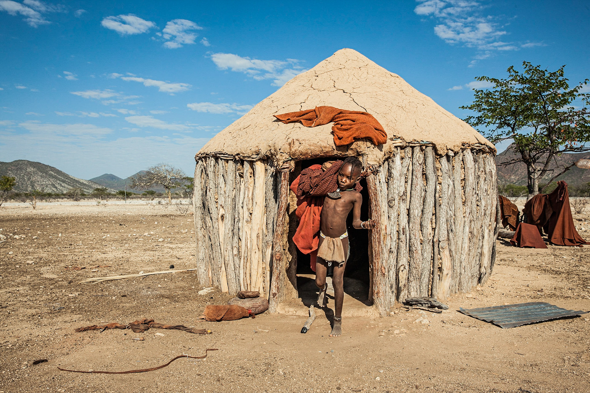 Himbské chýše jsou opravdu skromné. Žádná postel, jen udusaná hlína a na ní maximálně položená kůže z kozy.