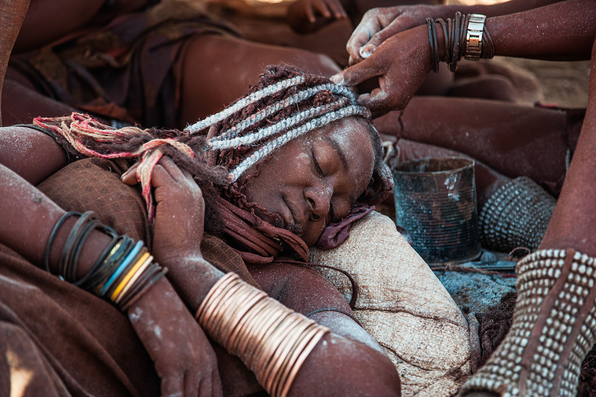 Denním stereotypem himbských žen je splétání ozdob z vláken pocházejících z pytlů od kukuřičné mouky.